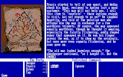 The title differs from previous Infocom outings in that you do not type any of the commands. Instead, you select them with the arrow keys from an interface that distinguishes between high-level party commands (most of which move you to a new place or situation) and micro-level individual commands, aspected to the skills and abilities of each character. Thus, the party leader, Bergon, can almost always "Ask for Advice." Praxix has a perpetual "Cast" option, and Tag has most of the inventory options. I find the interface inoffensive, but not as revolutionary as the developers were clearly intending.